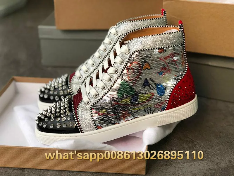 Red bottom shoes Designer high top silver spikes men shoes Red Bottom Sneakers designer leather Fla